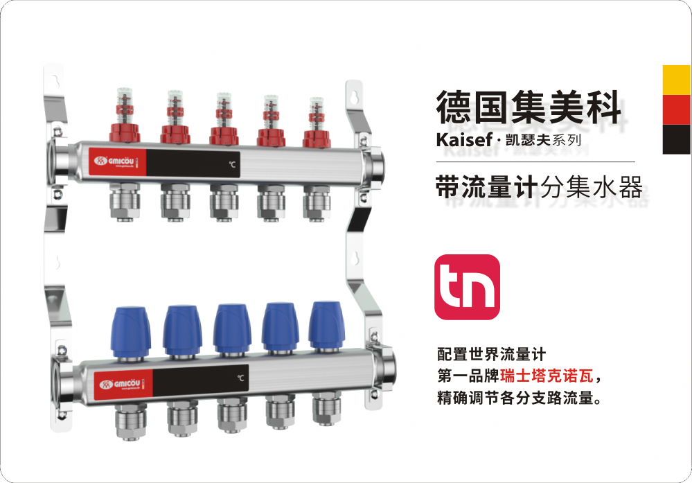 德國集美科帶流量計分水器配置世界流量計第一品牌瑞士塔克諾瓦,精確調節各分支路流量,冷加工生產工藝,內部無應力,可用于新型的地板輻射供暖系統,大流量,更好的調節各路平衡。