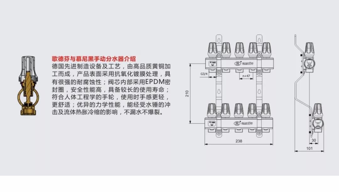 ●分集水器采用國(guó)標(biāo)HPb59 - 1優(yōu)質(zhì)黃銅, 銅本色抗氧化鍍膜處理防腐蝕。