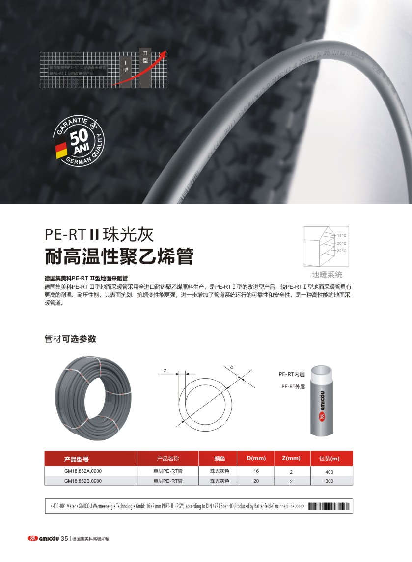 德國集美科PE-RT Ⅱ型地面采暖管采用全進口耐熱聚乙烯原料生產,是PE-RTⅠ型的改進型產品,較PE-RTⅠ型地面采暖管具有更高的耐溫、耐壓性能,其表面抗劃、抗蠕變性能更強,進一步增加了管道系統運行的可靠性和安全性。是一種高性能的地面采暖管道。
