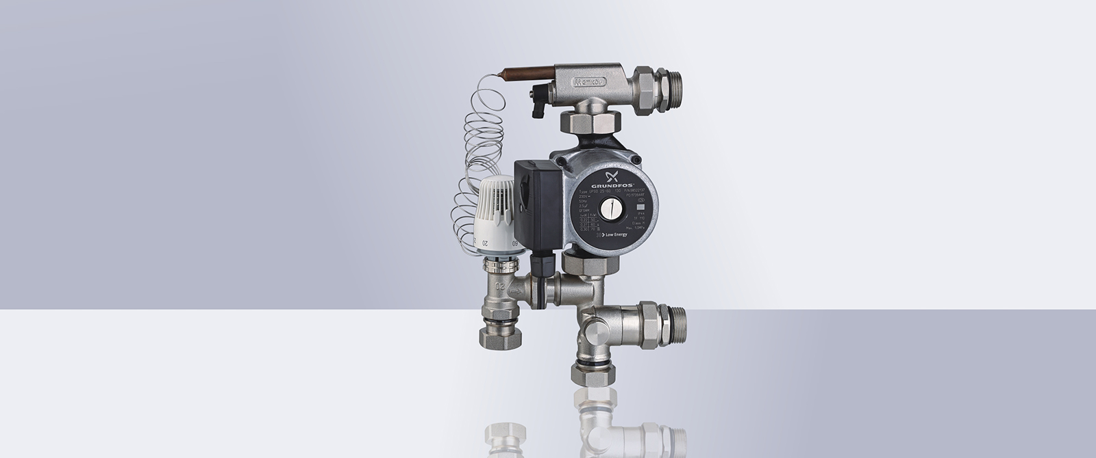 壁掛爐產出的高溫熱水進入到混水系統,通過循環泵的作用,使地暖系統的回水一部分回到混水系統中,與壁掛爐產出的高溫水混合之后,進入地暖系統采暖。液體溫包通過感溫探頭感應混合后的水溫,調節溫控閥。若混水溫度高于設定的溫度(如55℃),則液體溫包自動膨脹,產生壓力使溫控閥的閥門關小,減少壁掛爐高溫水進入混水系統的水量;若混水溫度低于設定的溫度(如55℃)。則液體溫包自動收縮,使溫控閥閥門開度更大,增加壁掛爐高溫水進入混水系統的水量,通過這種自動化的調節,使水溫穩定的達到地暖采暖的要求溫度。