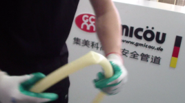 德國集美科PE-Xc管采用高密度聚乙烯(HDPE)為生產(chǎn)原料,加上其他輔助原料(如抗氧化劑等)。在塑料擠出機里擠出管材(未交聯(lián)),然后將擠出的未交聯(lián)管在輻射裝置上,利用高能粒子(β、γ射線)對聚乙烯作用,在聚乙烯分子鏈上產(chǎn)生自由基,自由基結(jié)合產(chǎn)生交聯(lián)鍵,進(jìn)行輻射交聯(lián)的。